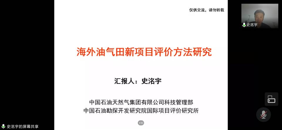 中国石油天然气集团有限公司史洺宇以《海外油气田新项目评价方法研究》为题目,从新项目评价特点和新项目评价内容与方法两个方面做专题报告。他指出评价是高度集中的多学科协同,技术经济评价工作应紧密围绕其商务目的。同时他从开发资产周期评价、油气藏工程评价、工程评价与投资预算和经济评价等方面对新项目评价内容与方法做了具体的阐述。