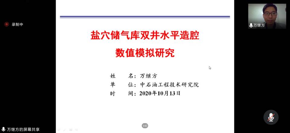 中国石油集团工程技术研究院万继方讲解《盐穴储气库双井水平造腔数值模拟研究》。他在简述研究的目的和意义之后,详细介绍主要研究工作。研究过程中,首先建立溶腔过程的流动传质和边界移动数学模型,对溶腔模型进行数值求解,然后对双井水平造腔腔体扩展规律以及腔体运行稳定性进行了研究。该研究的主要研究成果包括编制了双井水平水溶造腔软件SOLMC、优化了造腔工艺和推荐了注采压力和套管鞋深度。