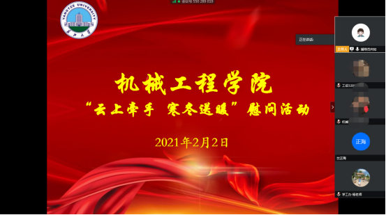 献一份爱心,温暖冰冷寒冬,送一句问候,心中阳光和煦。2021年2月2日下午14点,必威西汉姆官网平台开展了“云上牵手 寒假送暖”慰问活动,参加此次活动的有:公司党委副书记竺正海老师、资助专干杨琴老师以及2020级的两位同学,辅导员向如主持活动。