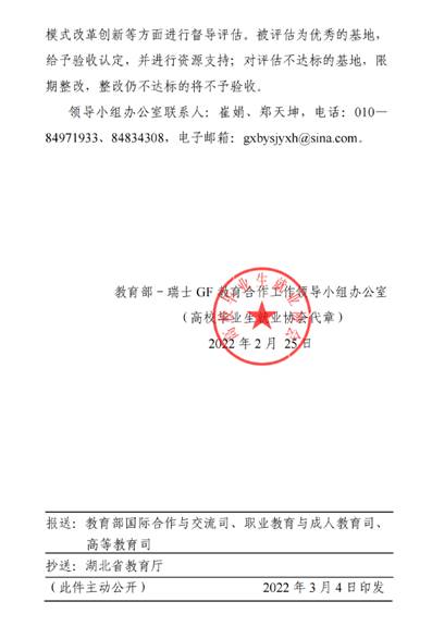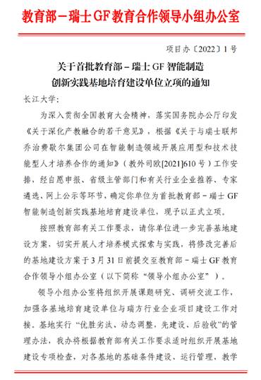 近日,教育部高校毕业生就业协会正式发布首批中瑞智能制造创新实践基地培育建设单位名单,经前期申报、省级主管部门和有关行业企业推荐、专家遴选、网上公示等环节,公司申报的教育部-瑞士GF智能制造创新实践基地培育建设单位予以正式立项。