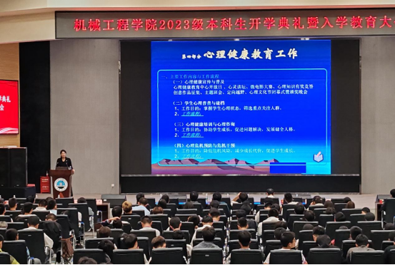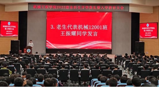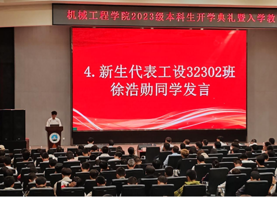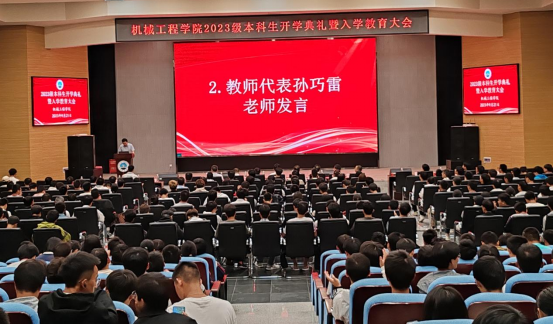 大会第二项:教师代表孙巧雷副教授发言。作为专业课老师,作为班主任,他结合自己的求学,生活及成长之路,告诉2023级新同学们在机械工程的海洋里要有梦想,能坚持,敢担当,要学会低头走路,脚踏实地,懂得抬头看路,心向远方。孙老师还激励同学们要怀揣一颗爱国之心,以科学支撑强国梦想,以技术创造美好生活, 用新时代赋予青年员工的历史使命,在实现两个一百年奋斗目标的生动实践中勇挑重任。