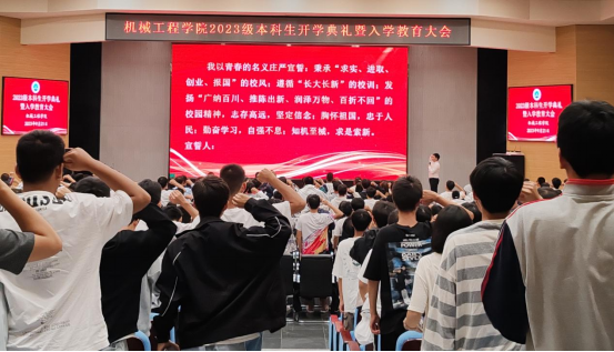 大会第五项:新生入学宣誓。在张涛同学的领誓下,必威西汉姆官网平台全体新生举起右手,以雄浑有力的声音许下勤奋学习,自强不息的青春誓言!