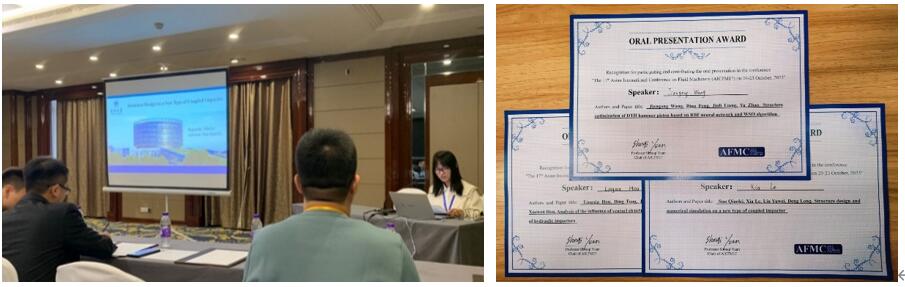 会上,21级博士研究生王健刚、22级博士研究生侯灵霞和22级硕士研究生夏乐分别作了题为“Structure optimization of DTH hammer piston based on RBF network and WSO algorithm”、“Analysis of the influence of venturi structural parameters on the performance of hydraulic impactors”和“Structure design and numerical simulation on a new type of coupled impactor”的分会场学术报告。