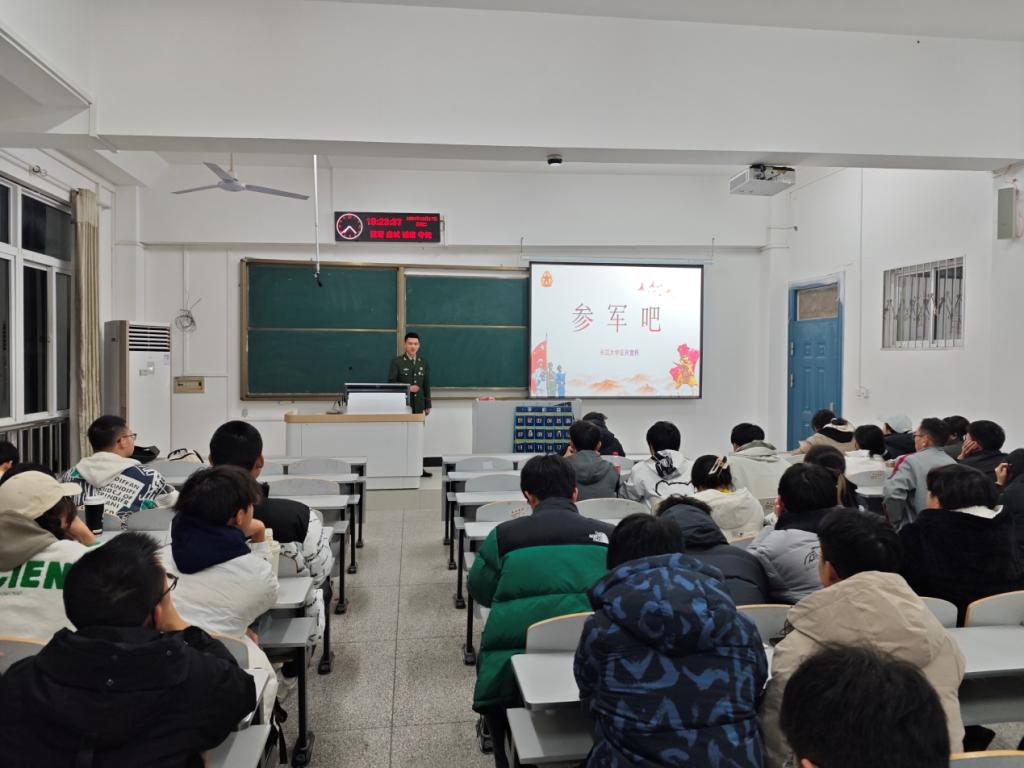 冯宇飞曾服役于武警安徽总队某警卫中队,对军营生活有着深切的体验和深刻的理解。他与同学们分享了丰富多彩的军营生活,生动讲述了军营中的训练场景、日常活动以及战友间的深厚情谊,详细介绍了入伍条件、报名流程和优待政策等一系列入伍政策。最后冯宇飞强调,军营是一个锻炼意志、提升自我、培养团队精神的绝佳场所,是青年人成长和实现自我价值的重要舞台,希望同学们积极报名参军,成为国防力量的新鲜血液。