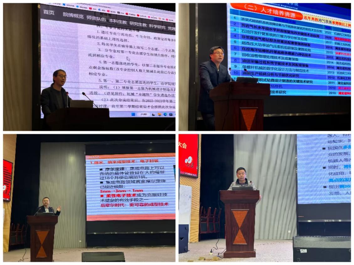 会议伊始,吕志鹏经理对本次专业分流的具体实施方案进行了讲解,详细说明机械“卓越班”员工遴选办法,并鼓励同学们积极填报;李宁主任对机械设计制造及自动化学科专业进行了介绍,让同学们对学科优势和相应的人才培养方案进一步了解;李欢主任介绍了材料成型及控制工程所要具体学习的内容,以及该其考研优势和就业优势;李安定主任向同学们讲解机器人工程专业,介绍了该专业的学习方法,也分析了其发展前景。