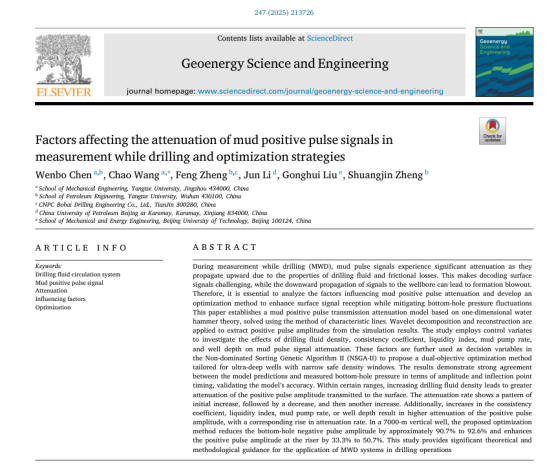 (通讯员 王俊)公司硕士陈文博在《Geoenergy Science and Engineering》发表关于随钻测量(MWD)工具应用安全的最新研究成果“Factors affecting the attenuation of mud positive pulse signals in measurement while drilling and optimization strategies”,由必威西汉姆官网平台王超副教授和石油工程公司郑双进教授联合指导。