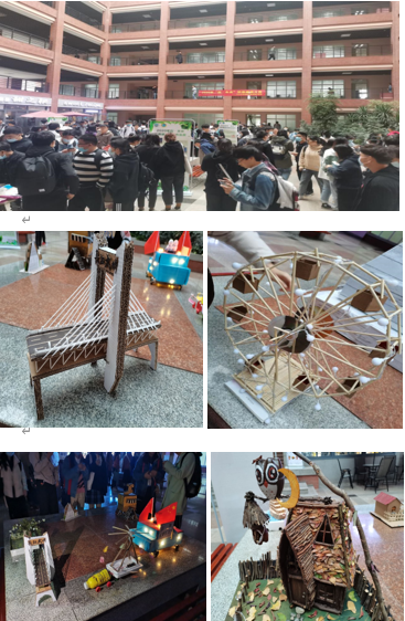 本次环保建模作品种类多种多样,有雄伟壮观的摩天轮、气势恢宏的乘风破浪战舰、造型奇特的机械总运动员瓦力、独具一格的小台灯、巧夺天工的复古童话梦幻小屋、别具匠心的乡村小屋……同学们充分运用专业知识,将随处可见的材料,如树枝、纸板、筷子、塑料瓶等制造出了精美、朴素的成品,通过旧物改造活动,加强员工在环境教育中的实践性、动手能力和创新能力,促进员工环境实践能力的提高。许多老师和同学驻足展览处欣赏环保建模作品展,工作人员耐心地向大家介绍作品的设计理念,并进行功能展示。