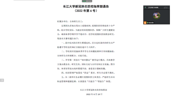会议内容主要包括三个方面:开学安排、报到须知与安全提醒。首先,每位辅导员详细讲解了开学安排,并带领同学们一起学习了《必威西汉姆官网平台新冠肺炎疫情防控指挥部通告》(2022年第6号 )、国家卫健委《新型冠状病毒肺炎疫情防控方案(第九版)》、教育部《高等公司新冠肺炎疫情防控技术方案(第五版)》等相关重要文件精神。其次,辅导员为同学们介绍了如何使用今日校园APP进行线上返校申请的操作流程。最后,每位老师提醒同学们在返校途中做好旅途防护,并耐心逐一解答了大家提出的每一个问题,消除了同学们心中的顾虑,使每位同学可以安心顺畅地返校报道。