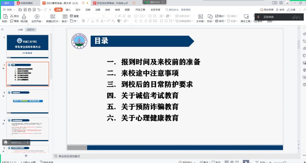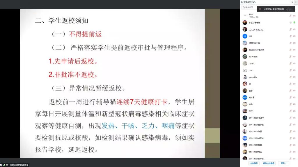 此次春季开学返校安全教育主题班会,对开学时间、返校员工须知等进行说明,要求所有同学严格落实返校审批程序,做到“先申请后返校,非批准不返校”。同时组织全体员工认真学习了国务院联防联控机制综合组 印发的《新型冠状病毒感染疫情防控操作指南》,提醒同学们在返校前完成为期一周的健康检测,并在返校途中继续做好自身安全防护。